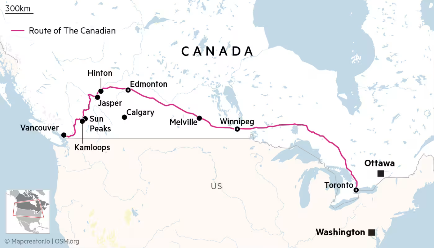 The train that binds Canada together: Slowly rolling across prairies and mountains from Toronto to Vancouver, the 97-hour Canadian is the longest passenger train outside Russia (Financial Times)